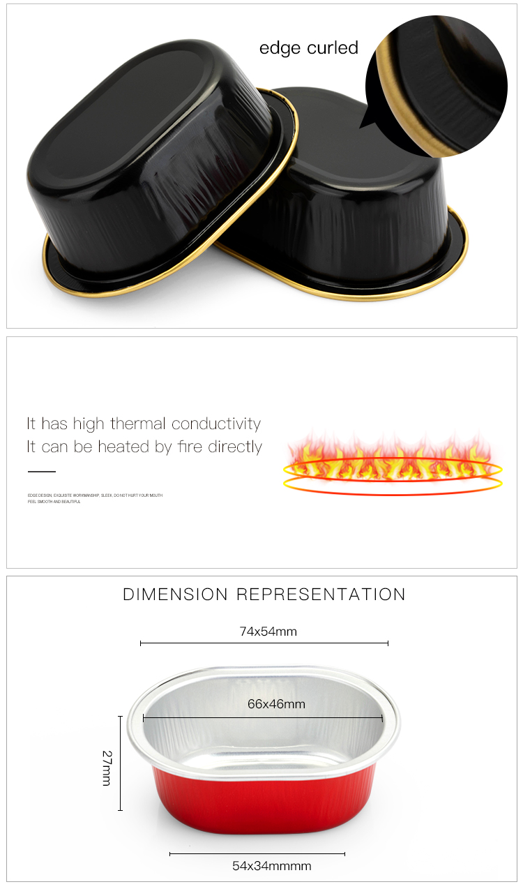 Ce récipient en papier d'aluminium est généralement utilisé dans la production de pudding au caramel et sa capacité est adaptée au pudding au caramel. Et il peut résister au feu léger, ou il peut être chauffé au four à micro-ondes. Ainsi, de plus en plus de magasins de desserts choisiront ce récipient en papier d'aluminium pour préparer du pudding au caramel.